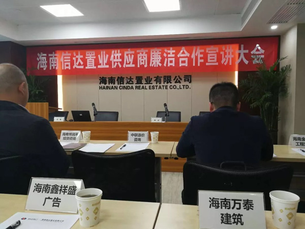 12月22日,海南信达置业供应商廉洁合作宣讲大会成功举行。本次大会旨在进一步加强各单位之间的廉洁合作,抵制和杜绝行贿受贿等违法违规行为,强化合作机制,从而实现互惠共赢。海南万泰副总张宇代表公司出席了本次大会?;嵘?,张宇副总代表海南万泰宣读了合作方廉洁承诺书。