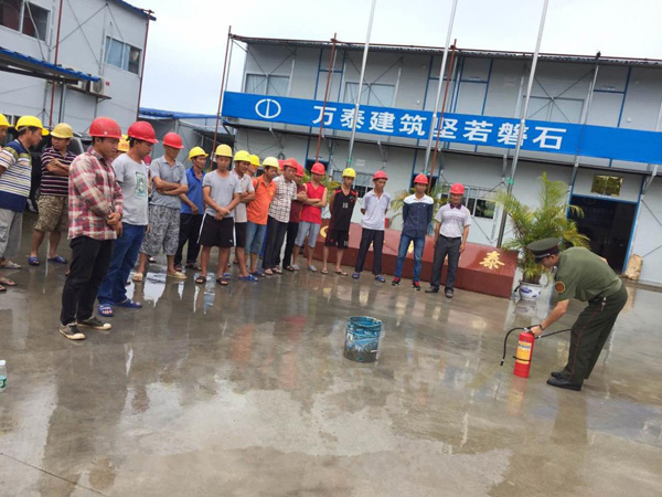 为提高全员消防意识,增强工人在紧急情况下的应变能力和自我防护能力,加强工地消防安全管理,强化工地自查自纠工作机制,有效消除火灾隐患,营造一个安全文明的施工环境。8月29日上午,海南万泰建筑工程有限公司邀请了琼中县消防大队,在琼中加钗农场加鑫商业广场项目部开展了意义重大的消防演练活动,带领项目工人学习消防知识技能。