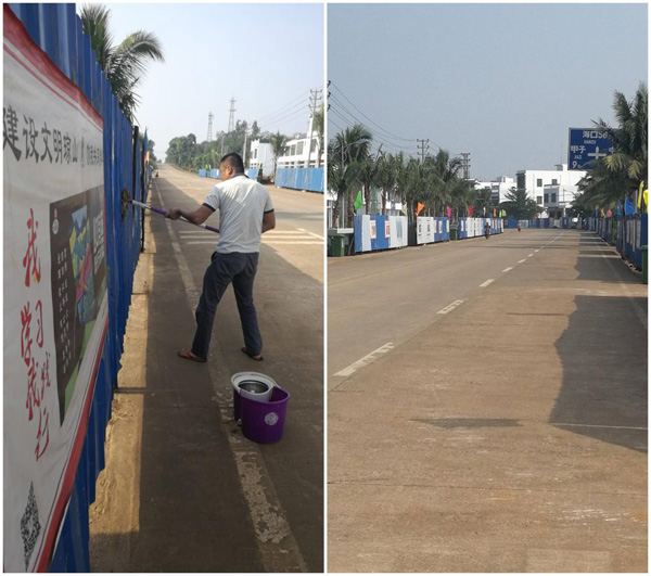 为积极做好大坡、三门坡、红旗和云龙四个镇墟改造ppp项目沿线的环境卫生,展现良好的企业形象,助力环岛国际自行车赛,自接到消息起,万泰便将相关要求下发至项目部,要求项目部做好大坡、三门坡、红旗和云龙四个镇墟沿线的相关工作。从26日起,万泰自发组织了一批工人,积极投入到准备工作当中。对公司承建的镇墟改造ppp项目的围挡、防护等设施进行细致排查,组织工人对项目沿线的环境卫生进行清扫。经过三天的奋战,大坡、三门坡、红旗和云龙等四个镇墟项目提前完成了相关准备工作,道路干净整洁,为该路段的环岛国际自行车赛营造了一个整洁有序的比赛环境。