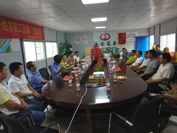 海南万泰建筑工程有限公司五指山清能·丽景湾一期一标项目部在会议室组织农民工工资集体发放暨海南万泰建筑工程有限公司“送清凉”活动。此次共计发放农民工工资150余万元现金。共送去夏季防暑凉茶50箱、绿豆300斤、冰糖150斤等一批物质。