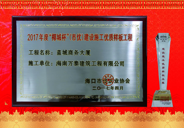 2015年3月,由万泰承建的【蓝城商务大厦】工程,荣获海南省建设工程质量安全检测协会颁发的2015年度《海南省建筑施工优质结构工程》。