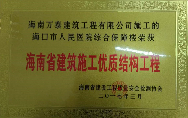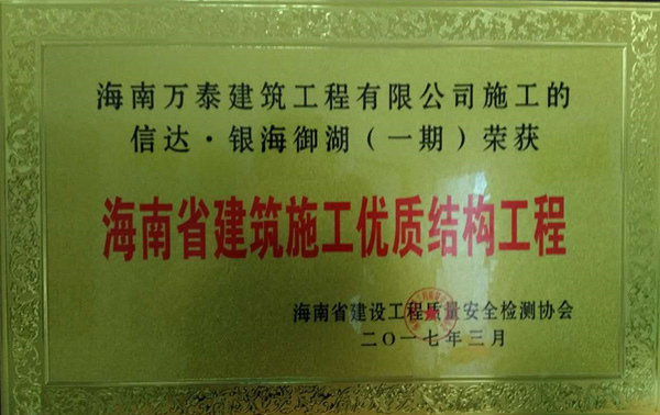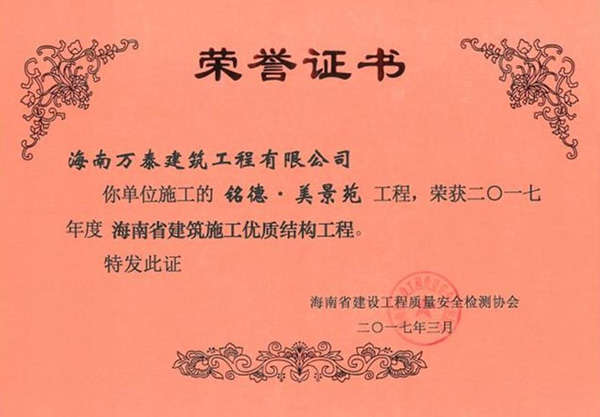 2017年6月20日,经过了长期的严格评审之后,由海南万泰承建的??谑腥嗣褚皆鹤酆媳U下ァ⑶砗P糯镆Sㄒ黄冢?、铭德.美景苑三个项目全部通过基础、主体阶段的评审,并荣获海南省建设工程质量安全检测协会颁发的《海南省建筑施工优质结构工程》证书。至此,继“蓝城商务大厦 ”荣获“椰城杯”后,万泰工程再斩殊荣。值得一提的是,这已经是万泰本年度第三次荣获相关奖项。