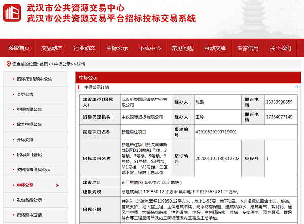 武汉国博项目位于武汉市新五里地区(博览中心D13地块),共9栋,地上1-55层,地下1层,总建筑面积109850.12平方米,其中地下面积 23654.81 平方米,计划工期为1150日历天。本次招标范围含土方、桩基、基坑支护、地下室工程、主体建筑结构、防水防腐保温、建筑给排水、建筑电气、智能化、通风与空调、大堂装饰装修、消防设施、电梯、室内精装修、幕墙、专变供电、园林景观、管网综合等工程量清单及施工图纸范围内工程施工总承包。