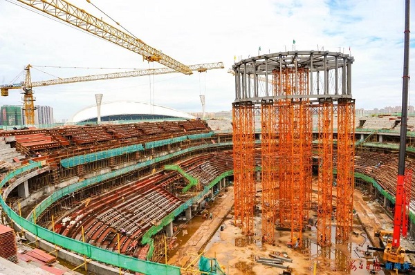 “目前项目钢屋盖中心环已吊装就位并焊接完成,标志着钢屋盖将进入快速施工阶段?!?月5日上午,在海口五源河体育馆项目施工现场,只见体育馆中心的钢屋盖中心环已现雏形。该项目土建主管陈显岛介绍,该项目预计将在今年底完成钢屋盖桁架的安装与调试。截至目前,项目总进度已超过50%,预计明年12月底可交付使用。