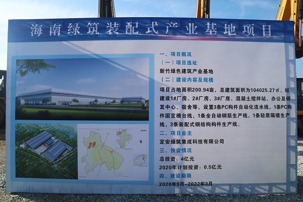 此次开工建设的海南绿筑装配式产业基地项目,选址定安县新竹绿色建筑产业基地,位于海南中线高速高路新竹出入口东侧、省道云文线北侧,在交通便利上有着无可比拟的优势。项目总占地面积200.94亩,总建筑面积104025.27㎡,总投资4亿元,拟建设1#厂房、2#厂房、3#厂房、混凝土搅拌站、办公及研发中心、宿舍等,设置3条PC构件自动化流水线,1条PC构件固定模台线,1条全自动钢筋生产线,1条轻质隔墙生产线,3条装配式钢结构构件生产线,2020年计划投资0.5亿元。项目建成后将大大提升定安县新竹绿色建筑产业发展的规模效应和产业集聚效应,逐步建成具有一定规模的绿色建筑产业基地。