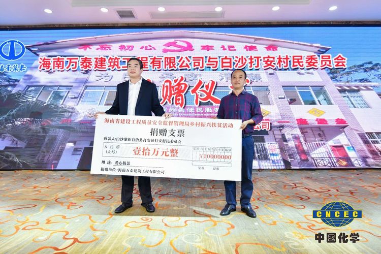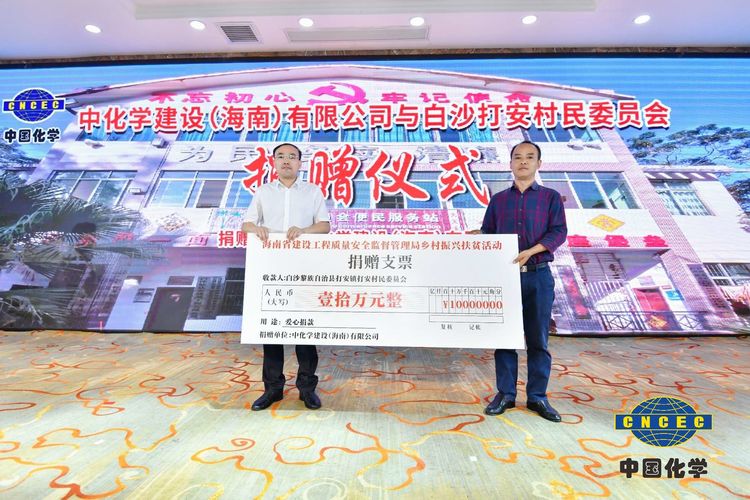 在捐赠仪式环节,中化学建设(海南)有限公司董事长姚辉国、总经理张小龙和海南万泰建筑工程有限公司常务副总经理颜利共同为白沙县打安村捐赠20万元,体现了企业在发展的同时,不忘承担社会责任,慷慨解囊,助力乡村基础设施建设,改善民生问题,推动乡村振兴工作进一步发展。