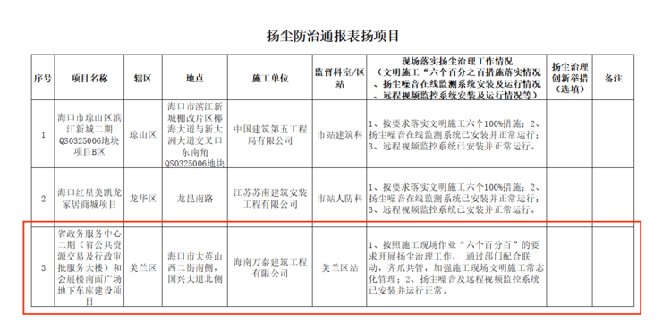 根据《2021年大气治理冲刺阶段管控措施清单》,??谑凶〗ň侄允芗嘣诮ㄏ钅抗さ亟写蚍挚己?,列出第一批红黑榜,对在扬尘防治方面表现突出的前3名受监在建项目工地记入??谑薪ㄖさ匮锍局卫怼昂彀瘛?,对排名在后5名的受监在建项目工地记入??谑薪ㄖさ匮锍局卫怼昂诎瘛?。海南万泰承建的省政务中心二期(省公共资源交易及行政审批服务大楼)和会展楼南面广场地下车库建设项目因按照施工现场作业“六个百分百”的要求开展扬尘治理工作,通过部门配合联动,齐抓共管,加强施工现场文明施工常态化管理,且扬尘噪音及远程视频监控系统均以安装并运行正常等,荣登??谑薪ㄖさ匮锍局卫怼昂彀瘛薄?/span>