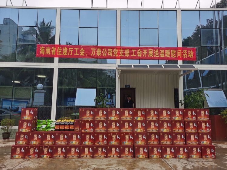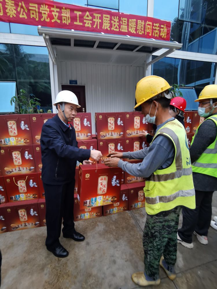 新春送温暖,真情暖人心。2022年1月11日,在新春佳节即将来临之际,省建设工会,海南万泰公司党支部、工会赴省政务中心二期项目开展新春慰问一线工人送温暖活动,为一线工人送去油米、年货等暖心物资。省建设工会常务副主席刘志伟、办公室主任黄符杰,万泰公司常务副总、工会主席颜利,党支部书记孟晨,工会副主席林慧等有关人员参加本次活动。