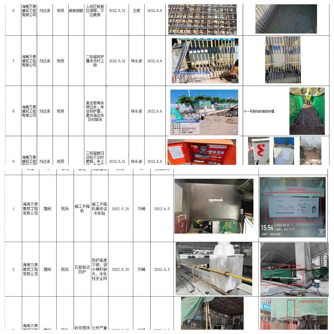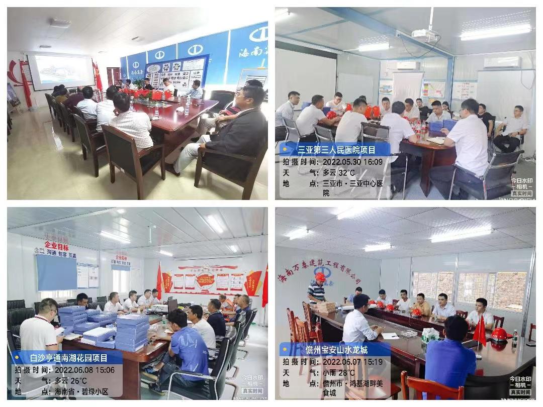 为落实海南省住建厅关于《海南省房屋市政工程安全生产治理行动实施方案》以及“党建引领促发展”2022年“安全生产月”活动暨项目标准管理宣贯大会的有关要求,进一步推动项目安全生产工作做深做实,履行安全生产监管职责,树立安全生产发展理念,结合全国安全生产月活动,2022年5月20日至6月8日,海南万泰公司开展2022年“安全生产月”各项目安全生产治理行动。本次检查小组由公司工程部人员组成,分别对海南省政务服务中心二期项目、海南省第三人民医院项目、化药生产及研发基地(二期)项目、佳元?七彩澜湾南区商业、四季康城?水岸城邦、三亚国际传媒中心项目二期等省内26余个在建项目进行系统、全面、彻底的检查。