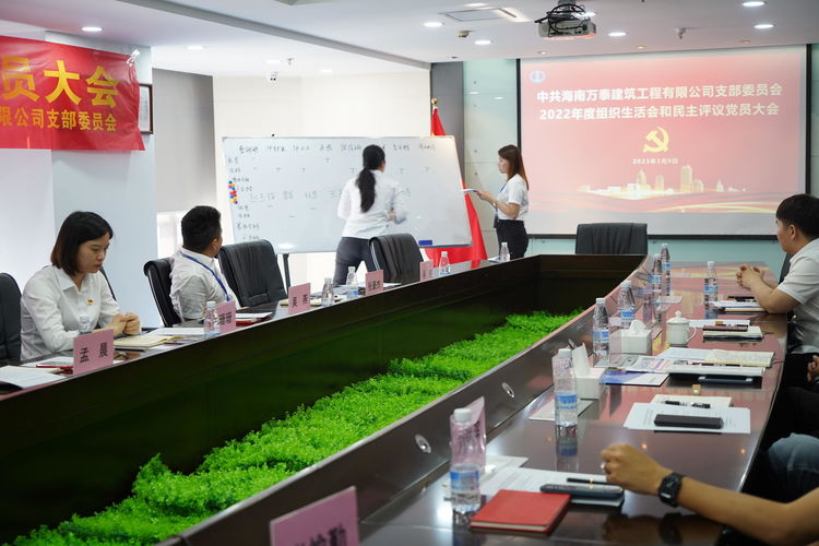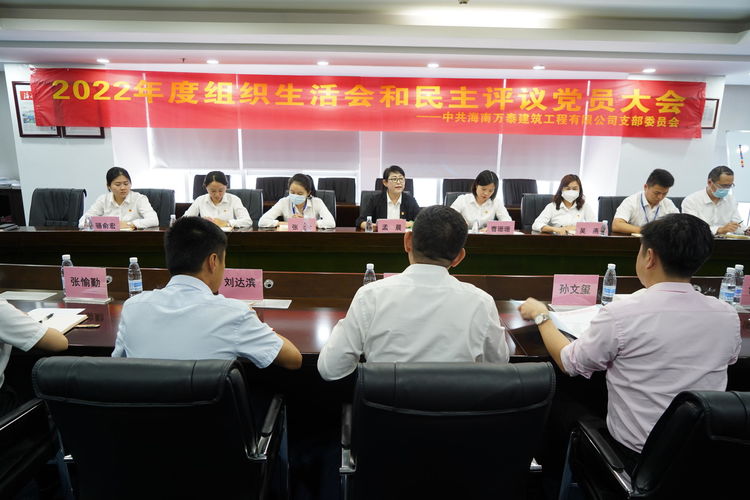 为全面贯彻落实习近平新时代中国特色社会主义思想,深入学习党的二十大、省第八次党代会精神,按照省住建行业党委统一安排部署,2023年3月9日下午,中共海南万泰建筑工程有限公司支部委员会召开了2022年度组织生活会和民主评议党员大会。省住建行业党委委员孙文玺莅临现场指导,万泰党支部全体党员参加本次会议,会议由党支部副书记孟晨同志主持。