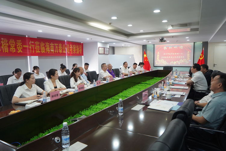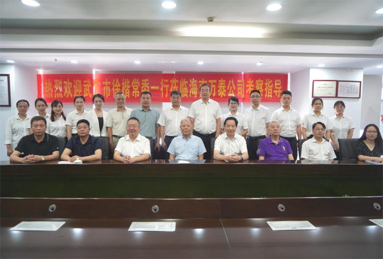 7月8日上午,湖北省武穴市委常委、统战部部长、市总工会主席徐楷一行莅临万泰公司开展座谈交流活动。双方围绕互相学习经验,拓展合作渠道等方面进行交流。武穴市财政局党组书记、局长程小明、武穴市梅川镇党委书记郭建涛、武穴市工商联主席邓广龙及武穴市政府有关部门领导,海南万泰公司有关人员参加会议?;嵋樘乇鹧胫谢Ыㄉ瑁êD希┯邢薰镜持Р扛笔榧恰⒆芫碚判×?、湖北省政府驻海南办事处主任冯健、海南省湖北商会常务副会长兼秘书长胡卫东等人一同参加了座谈会。会议由海南万泰公司常务副总经理颜利主持。双方通过观看宣传片及以PPT的形式介绍了海南万泰公司的发展历程、取得的主要成绩以及未来企业发展战略。