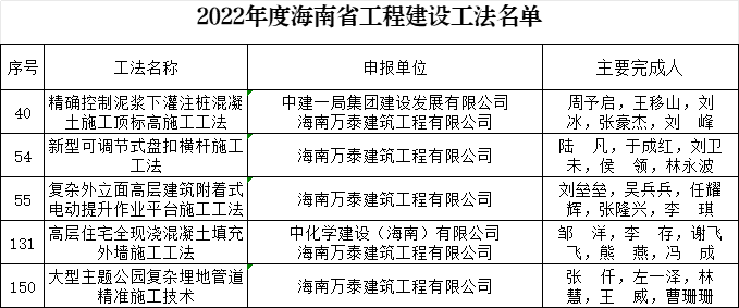 近日,由海南万泰建筑工程有限公司申报的《大型主体公园复杂埋地管道精准施工技术》《复杂外立面高层建筑附着式电动提升作业平台施工工法》《高层住宅全现浇混凝土填充外墙施工工法》《精确控制泥浆下灌注桩混凝土施工顶标高施工工法》《新型可调节式盘扣横杆施工工法》共5项省级工法通过省住建厅评审,并颁发了相应省级工法证书。据悉,这5项省级工法是公司的个别工程项目经过实践总结出来的技术成果,具有良好的安全性、经济性和适用性,可提高工效、缩短工期、大幅降低工程成本。此次通过的省级工法,是万泰在工程施工技术方面的重大创新,后续我司将广泛推广至各工程项目中加以应用。