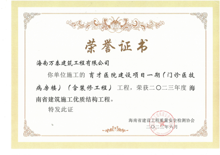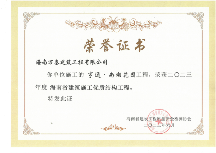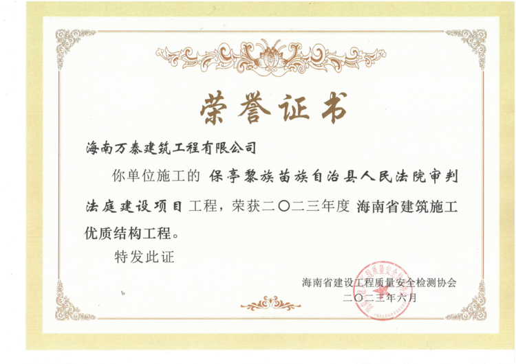 近日,由公司承建的育才医院建设项目一期、保亭黎族苗族自治县人民法院审判法庭建设项目、亨通·南湖花园分别通过了海南省建设工程质量安全检测协会的评审,被评为“2023年度海南省建筑施工优质结构工程”。该奖项代表着全省建筑工程结构施工质量的领先水平,是精品工程的重要标志。