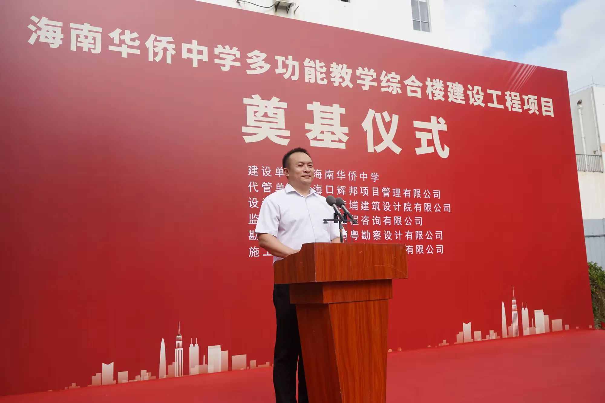 在开工仪式上,海南华侨中学党委副书记、校长张伟在讲话中指出百年大计,质量第一。施工单位要严格按照设计要求和施工标准,精心组织,科学施工,监理单位要认真履行职责,严格把关,高标准质检,一定要确保工程质量和安全。各参建单位要严格、认真履职,齐心协力、高效协同、攻坚克难,为广大师生提供一个教学设备更加先进,教学设施更为完善,学习环境更为优美的学习场所。