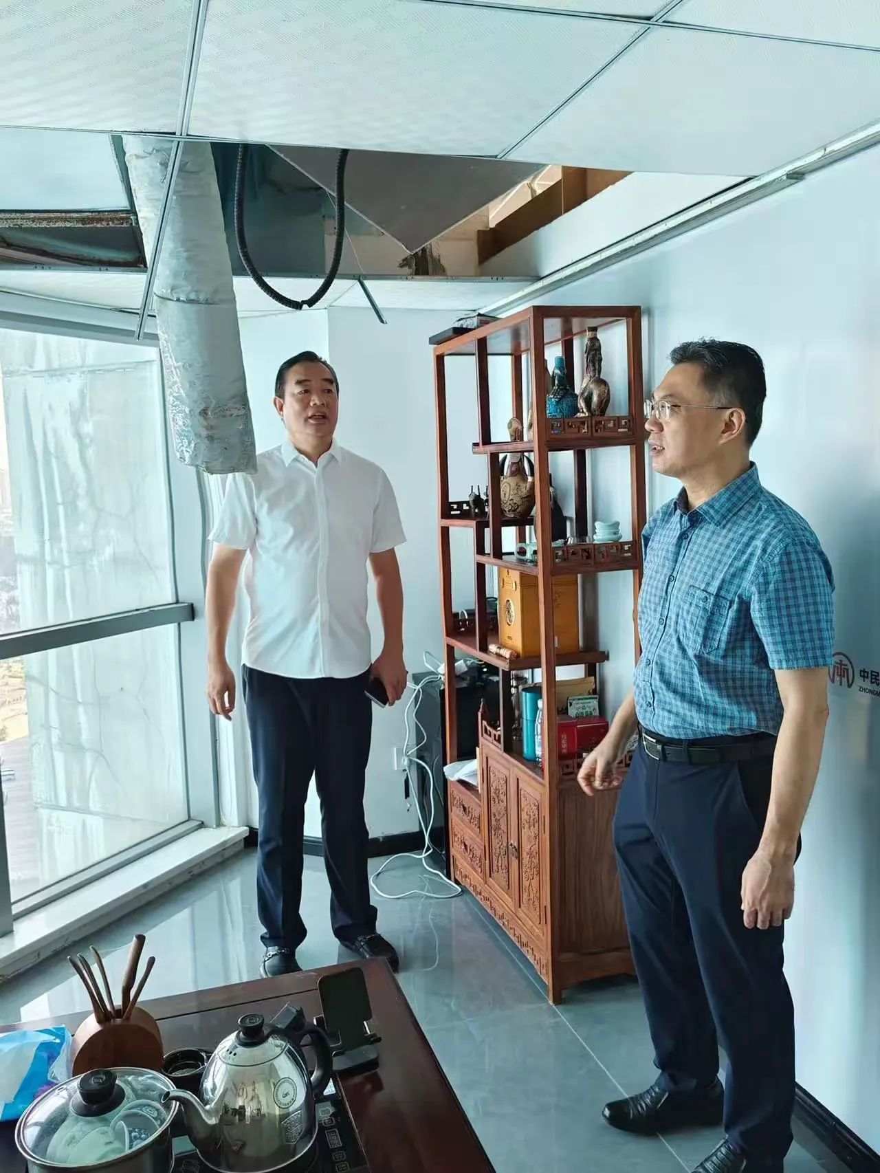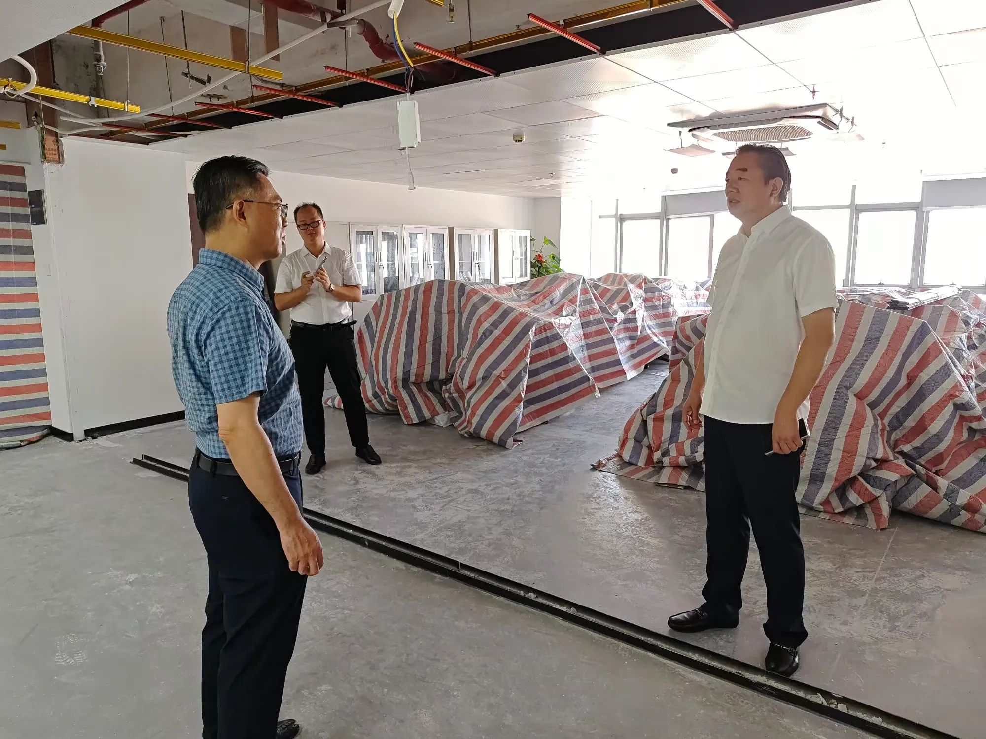 林青主委一行在公司总经理颜利的带领下查看了公司几个因台风“摩羯”而受损的办公区域。在调研座谈会上,公司总经理颜利通过PPT图片形式向林青主委一行介绍了本次受灾受损情况,企业办公区域积水、渗水严重,吊顶脱落、玻璃吹碎、设备损坏,多个项目部及工人生活区板房被吹塌、设备及电箱围墙等受到严重破坏。颜利总表示,上述问题给企业造成了巨大的经济损失,严重影响了复工复产的进度,请各级政府部门能够给予广大企业更多的关怀和帮助,出台政策及措施助力企业走出困境。