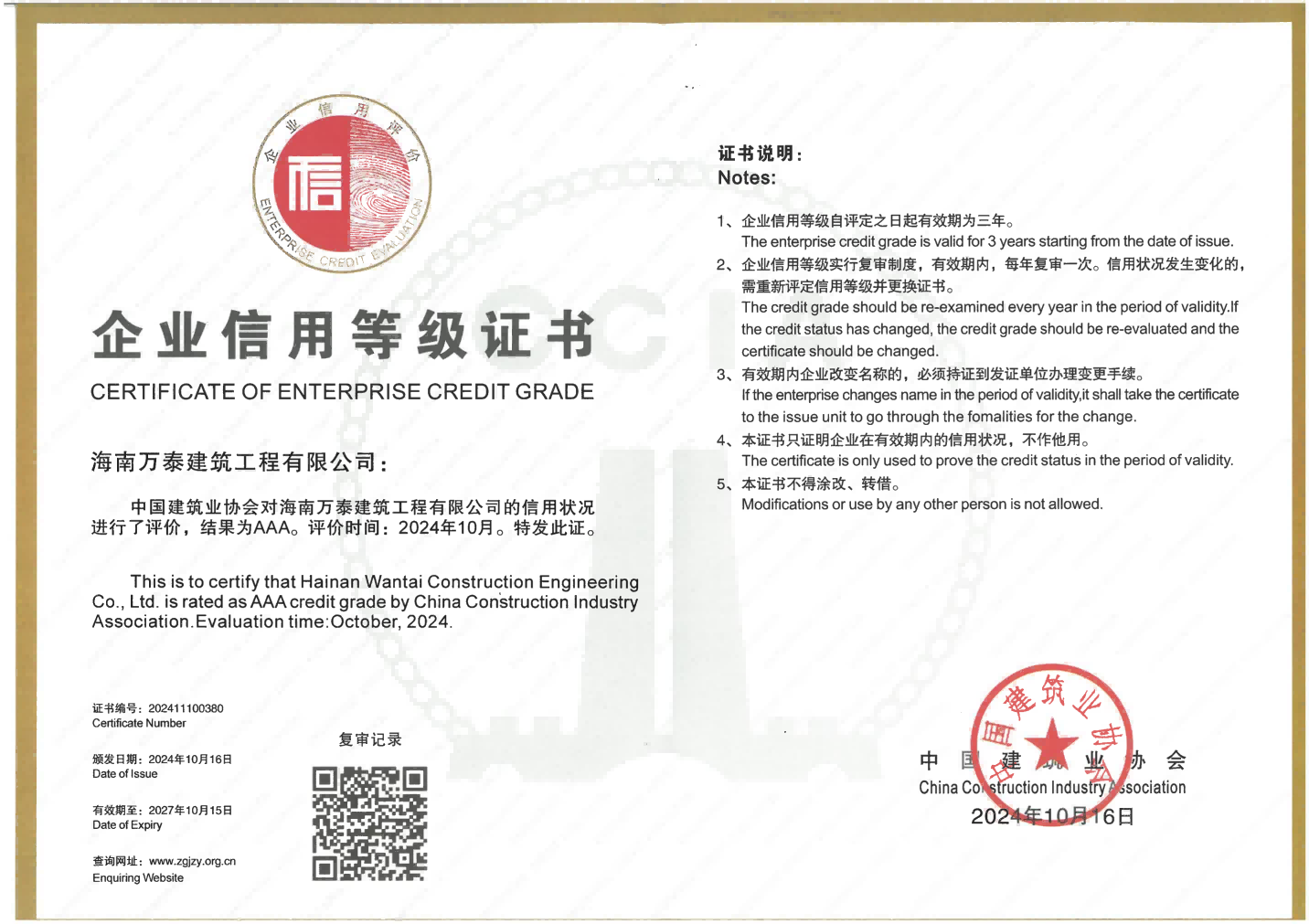 近年来,海南万泰公司积极践行“铸万泰精品,立万泰丰碑”企业理念,高度重视信用评价,以信用换市场、以品质铸品牌,在企业管理、项目履约、安全质量、社会责任等方面屡获好评。下一步,海南万泰公司将以此次获奖为契机,再接再厉,坚持以信为本,打造优质工程、诚信企业,积极履行社会责任,争当建筑业高质量发展的标兵榜样。