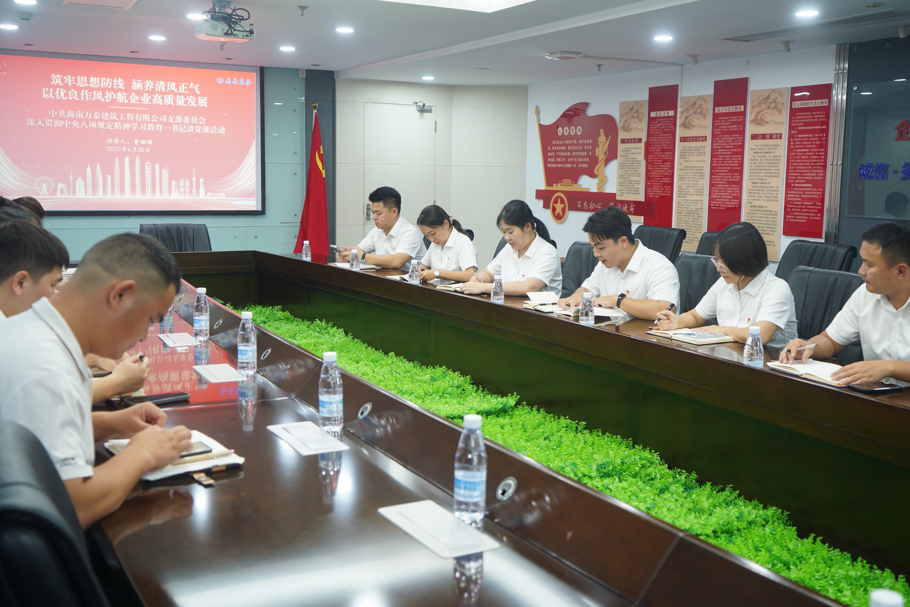 为深入贯彻中央八项规定精神学习教育,引导党员干部学深悟透,6 月 30 日下午,海南万泰公司党支部在党建会议室组织开展了深入贯彻中央八项规定精神学习教育暨书记讲党课活动。本次会议由党支部书记曹珊珊主持,旨在进一步强化党员干部的作风建设,推动公司高质量发展。支部党员及入党积极分子参加了本次活动。