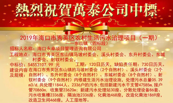 热烈祝贺海南万泰中标2019年??谑行阌⑶┐迳钗鬯卫硐钅浚ㄒ黄冢?东山镇(四标段)