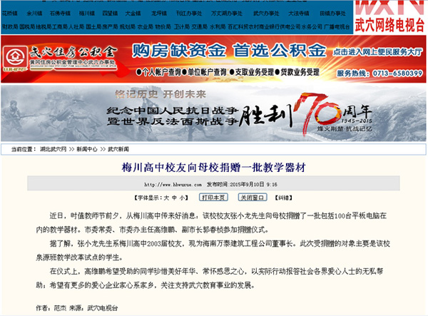 梅川高中校友张小龙向母校捐赠一批教学器材