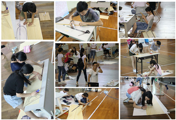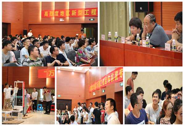 此次参赛的70支队伍按照赛前抽签顺序分别进行了加载测试。加载前,先由选手小心的将30公斤的铁块轻放在由竹皮、502胶水粘制而成的四层塔架上,塔架顶层还要放置4立升的水箱。参赛队员就其模型的设计思路、传力路径、构造特点及创新之处等方面做2分钟陈述。参赛作品各具特色,构思新颖,体现出了参赛队员扎实的力学与结构知识、活跃的思维、丰富的想象力及较强的创新意识。随后,评委老师提问,参赛队员答辩;提问内容多涉及基本力学及结构概念、模型受力性能等。之后,进行模型加载。加载共分三级,加载的控制位移依次增大;加载级数的递增不仅考验着模型的牢固性,更左右着参赛队员和观众们的心情。整个环节,工作人员各司其职,现场组织有条不紊,气氛热烈。