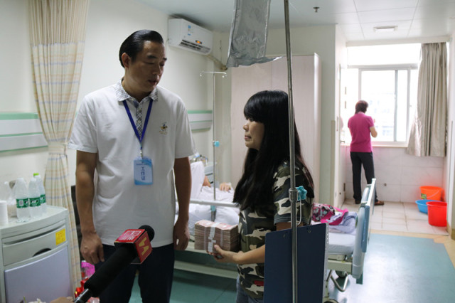 (万泰常务副总颜利将善款交给郑琳)