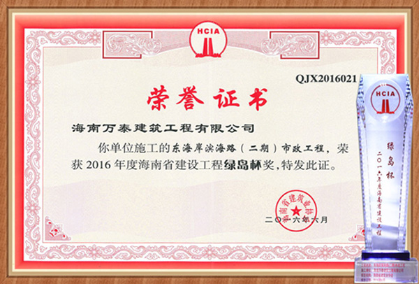 2016年6月13日,由海南万泰承建的东海岸滨海路(二期)市政工程顺利通过公示,喜获海南省建设工程“绿岛杯”奖项。