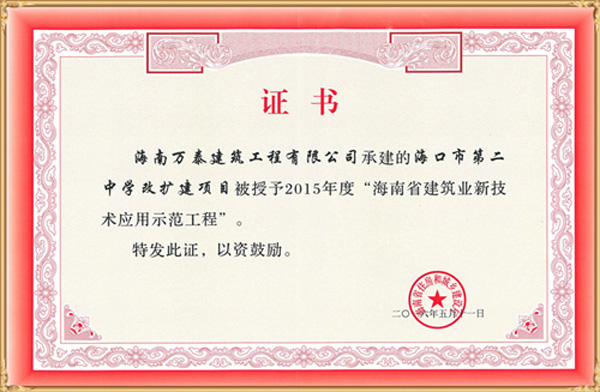 由海南万泰建筑工程有限公司承建的“??谑械诙醒Ц睦┙ㄏ钅俊北缓D鲜∽》亢统窍缃ㄉ杼谟?015年度“海南省建筑业新技术应用示范工程”。