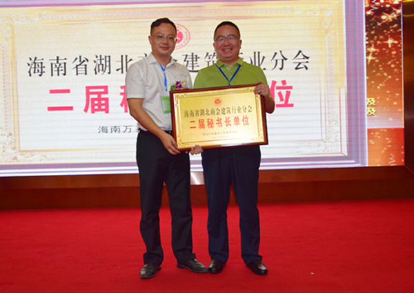 大会选举出建筑分会二届领导班子及会长、副会长、监事长、秘书长单位。海南万泰董事长张小龙顺利当选海南省湖北商会建筑行业分会秘书长。大会还为本届会长、副会长、秘书长、监事长单位举行授牌仪式。