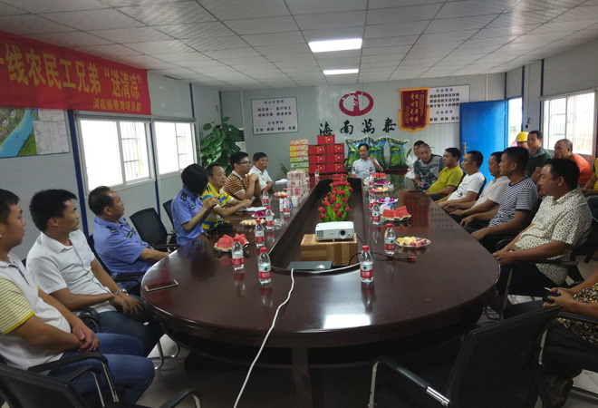 海南万泰建筑工程有限公司五指山清能·丽景湾一期一标项目部在会议室组织农民工工资集体发放暨海南万泰建筑工程有限公司“送清凉”活动。此次共计发放农民工工资150余万元现金。共送去夏季防暑凉茶50箱、绿豆300斤、冰糖150斤等一批物质。