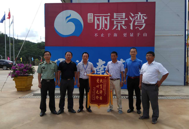 2017年4月25日上午,海南省纪委扶贫工作队队长劳文、省纪委驻毛道村第一书记李朝、五指山市毛道乡武装部部长胡国万一起将一面书有“扶贫济困、爱心无价”的锦旗送到海南万泰清能丽景湾项目部,感谢五指山清能置业有限公司、海南万泰建筑工程有限公司对五指山毛道乡贫困户危房改造工作的大力支持。